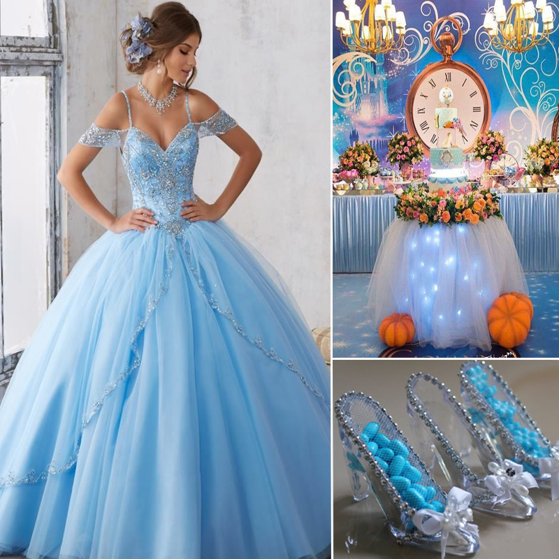 Celebra tu XV como solo una princesa sabe hacerlo al estilo Cenicienta, elegante y romántica, los colores de esta temática son dos: el azul y el blanco, dependiendo de tus gustos puedes ir desde un celeste muy claro con detalles en blanco, a un azul oscuro con detalles en plata o gris.