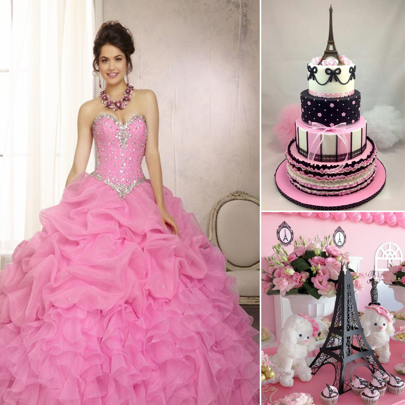 Todas soñamos con una noche en Paris con tonos rosa y negro, agregando les elementos correctos como la torre Eiffel, le damos el toque parisino a nuestra ambientación.